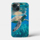 Underwater photograph of a sea turtle swimming in crystal clear water just below the surface.