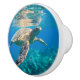 Underwater photograph of a sea turtle swimming in crystal clear water just below the surface.