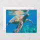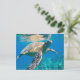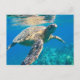 Underwater photograph of a sea turtle swimming in crystal clear water just below the surface.