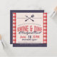 Having a swine and dine backyard summer feast? This cute, barbecue themed, invitation might help you out. Templates are included with this red white check side borders, navy blue, bottom border, and grill tools crossed at top. Fancy "Swine & Dine" typography is centred on a beige, rustic, wrinkled paper look background front. Matching navy blue background on back.