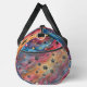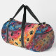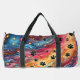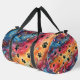 This colourful pattern duffle bag features a mesmerising swirling cosmic design in vibrant hues, liberally accented with classic black paw prints and twinkling stars. It's a unique and stylish pet accessory, perfect as a travel storage carrier for any pet lover.