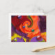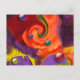 This post card features a brightly colourful abstract image of swirling colours and shapes in hues of purple, lavender, blue, green, red, and orange.