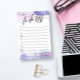 Personalised notes in white with purple and blue watercolor smudges and a practical to do list. The post-its' to do list has check-boxes to easily see which tasks or chores you've completed. Customise by adding your name. To do list is written in beautifully swirly calligraphy.
