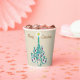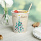 Beautiful paper cup with an original digital painting by Leslie Sigal Javorek of a swirly turquoise Christmas tree w/ violet ornaments on a Trompe L'oeil (trick of the eye) background illusion of fine bone china & greater depth.