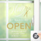 Opening hours window cling for your hair salon or hair styling business with Hair written in a white swirly calligraphy script next to a pair of gold coloured scissors. Personalise with your opening hours.