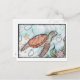 A beautiful postcard featuring a sea turtle swimming in the deep ocean surrounded by bubbles and flora.
