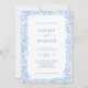 Wedding invitation with a blue swirly frame and a decorative back. The design is made to simulate a pebbled beach and every line of text can be customised.