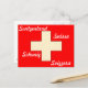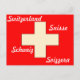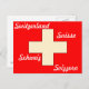A vintage looking postcard with the Swiss flag and the words "Switzerland , Suisse , Schweiz ,Svizzera" written in white letters .