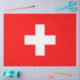 This design features the flag of Switzerland (officially the Swiss Confederation), which is a landlocked country in the middle of Europe. It is a federal republic, divided into 26 cantons; its capital city is Bern, while its largest city is Zurich. The country borders Germany to the north, Austria and Lichtenstein to the east, Italy to the south and France to the west. While most of the landmass is made up of the Alps, most of Swiss population lives on the plateau, where most major cities and economic centres are located, such as Zürich, Geneva and Basel. Switzerland has four official languages: German, French, Italian and Romansh, a less commonly spoken Romance language that is native to the country. The emblem of the Red Cross is the Swiss flag with switched colours.