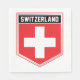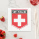 The national flag of Switzerland is infused into a shield shape that also has the country name set above the flag.