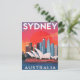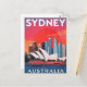 Capture the iconic beauty of Sydney, Australia, with this bold and vibrant travel postcard. The striking illustration features the magnificent Sydney Opera House set against the city's modern skyline and a dramatic red and orange sunset. The clear, block lettering declares "SYDNEY AUSTRALIA" at the top and bottom. This card is perfect for travel enthusiasts, architecture lovers, or anyone who appreciates retro-style posters and wants to send a unique, colorful greeting from down under.