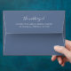 Modern wedding envelopes featuring a contemporary typographic design with "the wedding of" in elegant script typography. Below are your names and return address in a simple and minimal layout. The colour theme is dusty blue and may be changed the design editing tool.
