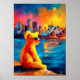 Warm Sydney teddy golden harbor artwork featuring a contemplative teddy bear silhouette overlooking the Opera House and Harbour Bridge at sunset. Bold fauvist colors and crisp segmented reflections create vibrant wall art perfect for australia lovers, nursery decor, and modern interiors.