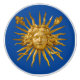 Symbol of Louis XIV the Sun King (Roi Soleil) on the golden gate of Chateau de Versailles with blue background