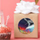 The flowing rainbow merging of land and sea from a larger, highly colourful artwork of two nature spirits - the Earth child, with her hair of flowers and plants, and gown of bright soil, flowing in rainbows into the bright blue ocean. The white spray of the cresting wave contrasts with the duller reds and purples of the setting sun.