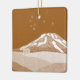 An illustration of Syme hut on Fathoms Peak, with Mt Taranaki in the background. This design is drawn in a brown monochrome and has the Matariki stars above it in the sky. A design for anyone who loves hiking and tramping in New Zealand.
