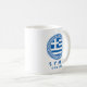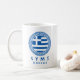 Symi, Greece coffee mug featuring the national flag of Greece inside a Greek blue Aztec circle and the name of the island written in Greek style. This mug is perfect for you to enjoy drinking your coffee while you are on vacation on the beautiful Greek island of Symi.