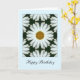 An abstract geometric symmetrical daisy pattern design on a pale blue background. "Happy Birthday" on the front and inside.