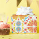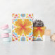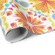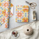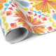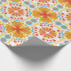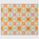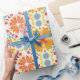 Colorful wrapping paper featuring a symmetrical pattern of orange and yellow flowers with blue accents. Shown unrolled and flat, conveying vibrancy and joy.