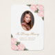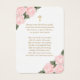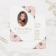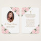 Elegant pink and gold floral memory card/funeral prayer card featuring a photo adorned with blush pink watercolor roses and baby's breath flowers on a plain white background.