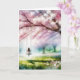 A serene scene features a girl on a swing under a blooming cherry blossom tree surrounded by a peaceful landscape.
