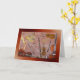 Against a background of reddish wooden planks are displayed all the instruments of the symphony orchestra. This card would be appropriate for any number of occasions, as an invitation, announcement, thank-you, or simply to write a note, to or from musicians and music-lovers.