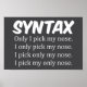 A funny typography illustration which has the word syntax and then some sentences explaining how important word placement is when you are writing. The funny design is about picking your nose. The word only is moved to different positions in the sentence to give it different meanings. I only pick my nose. This is a design that would be suitable for anyone learning or teaching the English language.