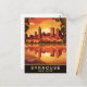 Syracuse postcard. City waterfront, Sunset over Syracuse skyline, New York State. Illustrated travel postcard in vibrant colours