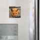 A close up photograph of a cute Syrian hamster printed on a square fridge magnet.