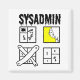 Sysadmin text and a drawing of four windows. One with a broken glass, another is boarded up. Sysadmin suspiciously peeks from behind the curtain of a brightly lit window. Magnet for fun and good mood.