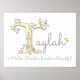 Pretty T monogram art name poster perfect for a girls bedroom or playroom in shades of grey, white, yellow, pink and purple. Personalise with your child's own name beginning with T, and name meaning for a truly personalised unique gift for your child's bedroom or nursery, this example is for the name T A tailor. Creative, honest and beautiful. Cute poster print ideal for a girls bedroom or to gift for a new baby, christening or baby shower gift. © Unique letter T monogram hearts and flowers drawing and graphic art design by Sarah Trett. www.sarahtrett.com for www.mylittleeden.com