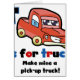 Boys who love trucks and cars will love this cute T is for Truck T-shirt, tote bag, mousepad, stickers, and more with a red pickup truck with eyes and a smile and text that reads "T is for Truck! Make mine a pickup truck!".