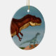 A Tyrannosaurus Rex and Velociraptor take a walk across a grassy field.