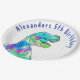 Let’s get this T-Rex dinosaur 5th birthday party started fun colourful Tyrannosaurus Rex add name party paper plates. Unique dino watercolor painting in teal green, blue, aqua, purple and yellow hues with modern blue typography just add your child’s name using the template to create a personalised scary Tyrannosaurus roar fifth birthday party paper plate. Original artwork by artist Catherine Sweetman.