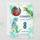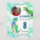 Colourful Roaring Tyrannosaurus rex dinosaur birthday party invitation with cool blue and teal green watercolor splash background. Fun T-Rex dino 8th birthday party invitation for the child who loves dinosaurs. Prehistoric Jurassic dino fans will love this multicolored psychedelic Tyrannosaurus rex design. Photo template and Modern typography with easy to use template just add a custom number of the birthday and the party details and you are all set for a fun packed dinosaur themed birthday. All dinosaur species are welcome. Original artwork Illustration by Catherine Sweetman