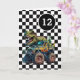 A dinosaur monster truck 12th birthday card for boys. Featuring a black and white chequered background on the front with a place you can easily personalise the age if needed. A Tyrannosaurus rex on top of a monster truck will delight all dinosaur and monster truck fans.