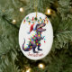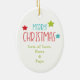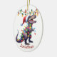 On the front of this cute keepsake ceramic ornament for a child is a T-Rex dinosaur wearing a red and white Santa hat. He is staring at a string of colourful lights above, while wrapped in the light string he has already torn down. Your child's name is at the bottom. The back of the ornament has a Merry Christmas message and your signature. Perfect for any child who loves dinosaurs.