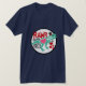 A t-shirt with an image of a green t-rex wearing a black top hat with hearts all around. Text says Rawr means I love you in t-rex.