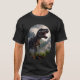 T-Rex standing before a rugged mountain range, Jurassic era vegetation framing the scene, a misty backdrop with the peaks piercing the sky, chiaroscuro effect highlighting the contrasts, digital painting, ultra realistic, cinematic.
