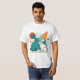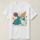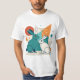 a white t-shirt featuring an illustration of two rabbits, one blue and one white, set against a geometric background with orange and blue shapes.