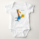 This image features a white baby garment printed with a cartoon giraffe dressed in a blue suit, cheerfully holding up a yellow sign that reads “Your Message Here!” The text “your text” above the giraffe suggests this is a customisable design. The whimsical, professional-looking giraffe makes it a charming and fun choice for personalised baby wear or novelty gifts.
