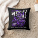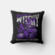 The centerpiece of this design features a highly detailed skeleton witch dressed in a flowing purple cloak and a tattered witch's hat. The skeletal figure is captured mid-flight, clutching a rustic broomstick as it soars through a trail of purple magical energy and splatters.