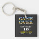 The design features massive, pixelated "GAME OVER" typography with a classic blue-to-gold metallic gradient, mimicking the look of 90s arcade cabinets. Centered below is the iconic prompt "CONTINUE?" followed by a bold white "10" second countdown timer.
