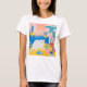 an illustration with a funny white cat sitting on a table in a bright yellow and pink room. A T-shirt with a cheerful print for a woman in bright shades.