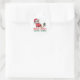 A tabby cat wearing a red Christmas hat and sweater with a Christmas tree on the tail, snowflakes on a white background.