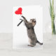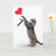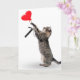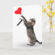 Grey tabby cat with red heart balloon for 7th birthday on white background.
