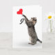 Grey tabby cat with red heart balloon for 9th birthday on white background.