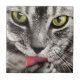 This design features a high-definition image of a tabby cat with gray and black fur and beautiful green eyes. It is confidently licking its own paw in order to groom itself.