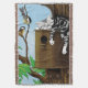 A cute tabby cat is sleeping pin a wooden birdhouse. The birds that reside there are not pleased