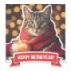 Cute tabby cat with shiny green eyes, wearing a red scarf, sitting next to a glowing New Year candle. Bright, photorealistic, and festive for Meowy New